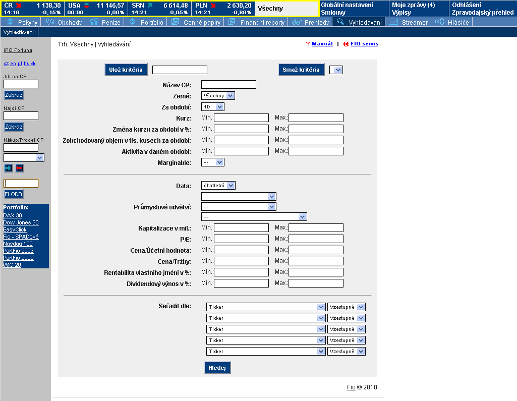 Aplikácia umožňuje taktiež vyhľadať a zobraziť množinu cenných papierov zodpovedajúcu definovaným parametrom a zadaným kritériám. V prípade, že vyhľadávate podľa definovaných parametrov častejšie, môžete si vyhľadávací formulár uložiť pod vlastným názvom - pri ďalšom použití už nemusíte formulár znovu vyplňovať.