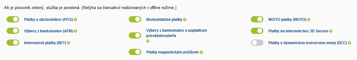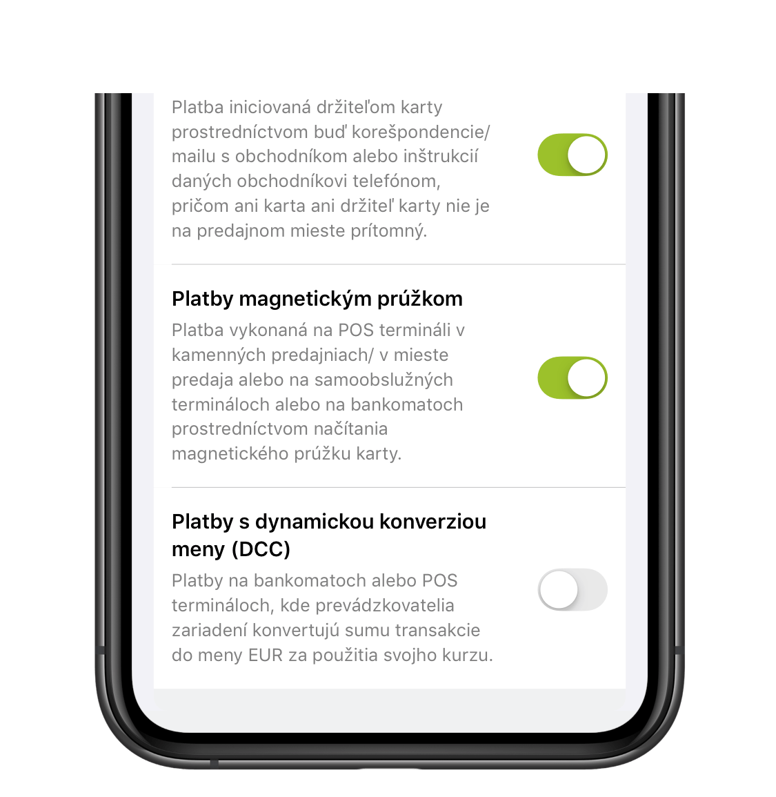 Vo svojom Smartbankingu aj Internetbankingu môžete blokovať vybrané typy transakcií, napríklad tie s nevýhodným kurzom (DCC), výbery v bankomatoch s dodatočným poplatkom prevádzkovateľa alebo internetové transakcie bez dodatočného overenia 3D Secure.