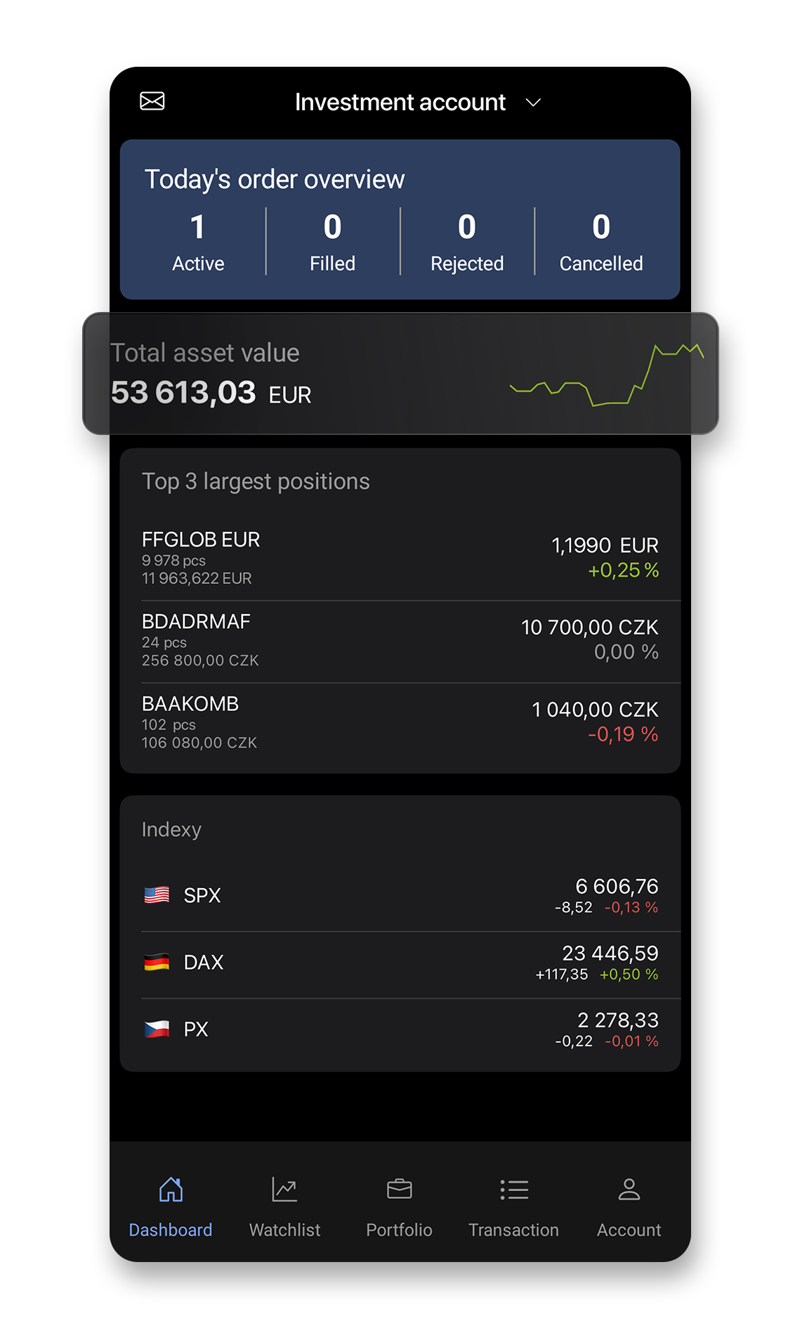 The homepage keeps you in the picture. You see an overview of instructions for the current day, the status of your assets, top 3 positions, and the development of major indices.