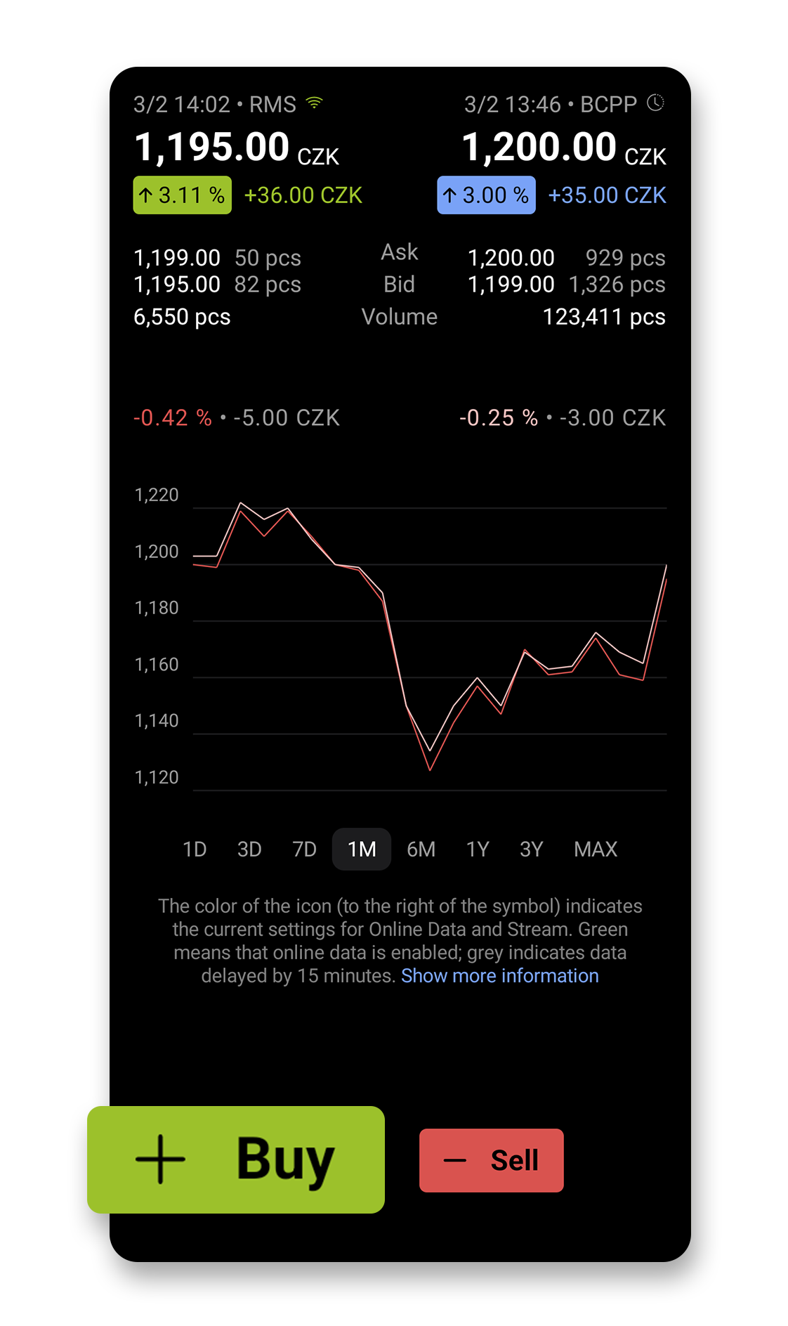 You can buy or sell securities at any time simply on their detail page, and conveniently and quickly by long-pressing the bid/ask on the Watchlist. On the purchase instruction at the bottom left, you can see your buying power, i.e., the money you have available. For a sell instruction, you see the total number of units of the given security you have in your portfolio.